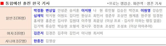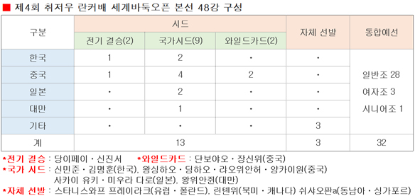 통합예선을 통과한 32명은 시드 11명, 와일드카드 2명, 자체 선발전을 거친 유럽ㆍ북미ㆍ동남아 대표와 더불어 본선 48강전 무대에 오른다. 본선행이 확정된 명단은 <표>와 같다.