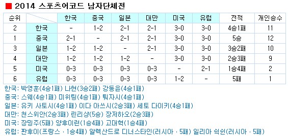 남자단체팀은 최종일 5라운드에서 최약체 유럽을 3-0으로 완파하고 종합전적 4승1패로 준우승을 차지했다. 금메달은 5전 전승의 중국이 가져갔다. 한국은 사실상의 결승전이었던 2라운드 중국전을 1-2로 패했었다.