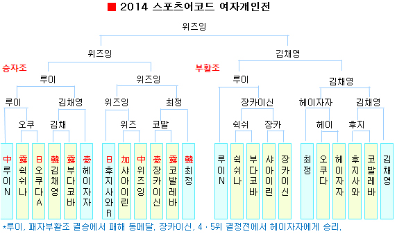 승자조에서 실족한 후 패자조서 일본의 여류 2관왕 후지사와 리나, 대만의 바둑요정 헤이자자, 중국의 철녀 루이나이웨이를 연파하고 최종 결승에 올랐던 김채영은 종반 들어 위즈잉의 과수로 찬스가 왔으나 아쉽게도 살리지 못했다. 위즈잉에겐 지난해 2월 황룡사배 패배에 이어 2패째(다만 스포츠어코드는 한국기원 비공식전이다).