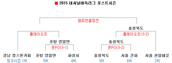 충청북도가 2015 내셔널바둑리그 챔피언결정전에 진출했다. 충청북도는 10월 28~30일 K바둑 스튜디오에서 열린 플레이오프에서 서울 천일해운을 풀세트 접전 끝에 3-2로 꺾었다. 충청북도에서 김정우와 김창훈, 천일해운에서 정훈현과 김세현이 이겨 2-2로 맞선 가운데 충청북도의 김현아가 박지영에게 불계승했다.