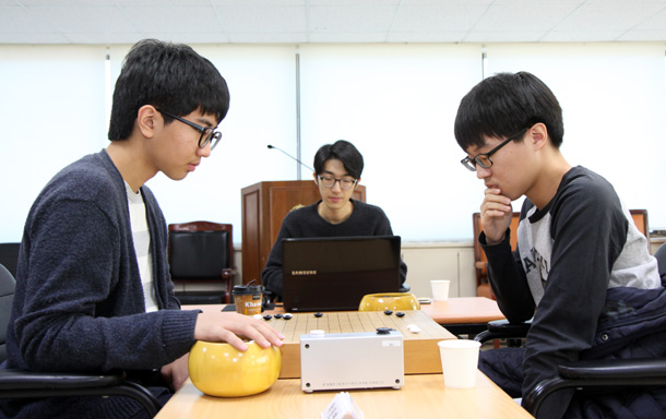 ▲ 2013년 영재 입단자 설현준 2단(오른쪽)은 2014년 영재 입단자 박진영 초단을 207수 만에 불계로 꺾고 B조에서 3연승을 올렸다.