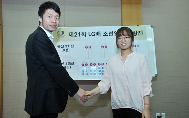 ▲ 여자기사 최최초로 12년 만에 LG배 통합예선을 통과했던 최정 6단(왼쪽)이 중국랭킹 15위 판윈뤄 4단을 꺾고 16강 진출에 성공했다. 순수 국내 여자기사가 LG배 16강에 진출하기도 최정이 처음이다.