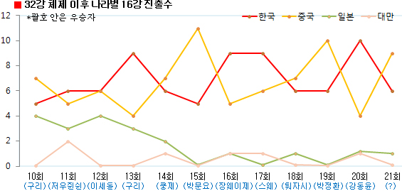 한중전 5승6패… 한국 6명, 중국 9명, 일본 1명 승리
