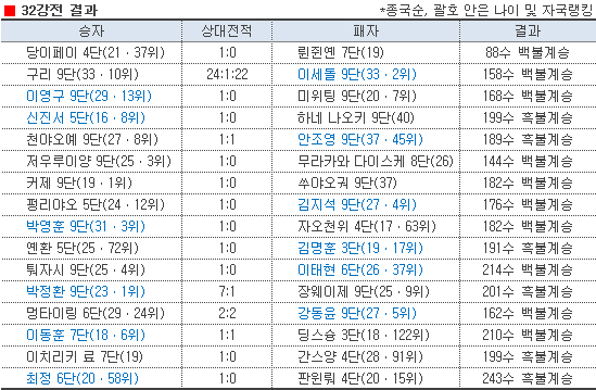 또 이동훈은 동갑내기 딩스슝을 불계로, 최연소 32강 신진서는 최연장 32강 하네 나오키를 불계로 격파했다. 병역의무를 마친 후 첫 세계무대 본선에 등장한 이영구가 세계 챔프 출신의 강호 미위팅을 상대로 한국 진영에 첫 승전보를 전해준 것도 값진 전과였다.