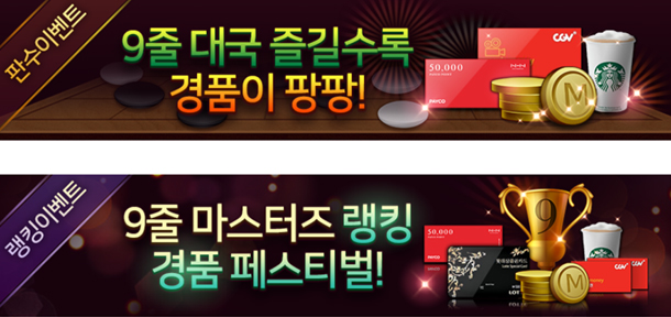 한편 한게임 바둑은 모바일 출시 기념 이벤트를 진행하고 있다. <9줄 대국 즐기면 경품이 팡팡>, <9줄 마스터즈 랭킹 경품 페스티벌>은 9줄 대국 판수에 따라 경품을 지급하며, 11월 월간랭킹에 따라 롯데 상품권, 페이코 상품권, CGV 영화관람권, 스타벅스 기프티콘 등 1000위까지 100% 당첨되는 풍성한 경품이 애기가들을 기다린다.