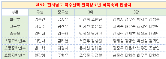 16~17일 이틀간 전라남도 순천시 주암면의 한국바둑고등학교에서 제5회 전라남도 국수산맥 전국청소년 바둑축제가 열렸다. 6개 부문(최강부, 고등부, 중등부, 초등고학년부, 초등중학년부, 초등저학년부)으로 치른 대회에는 250명의 참가자와 학부모 200명 등 500여명이 모였다.